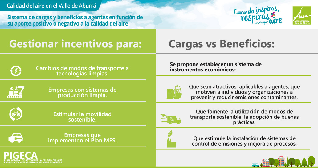 Por ello, el PIGECA propone establecer un sistema de instrumentos económicos, que sean atractivos, aplicables a agentes, que motiven a individuos y organizaciones a prevenir y reducir emisiones contaminantes, mediante el fomento y el estímulo a la utilización de modos de transporte sostenible, la adopción de buenas prácticas, instalación de sistemas de control de emisiones, mejora de procesos, entre otras.